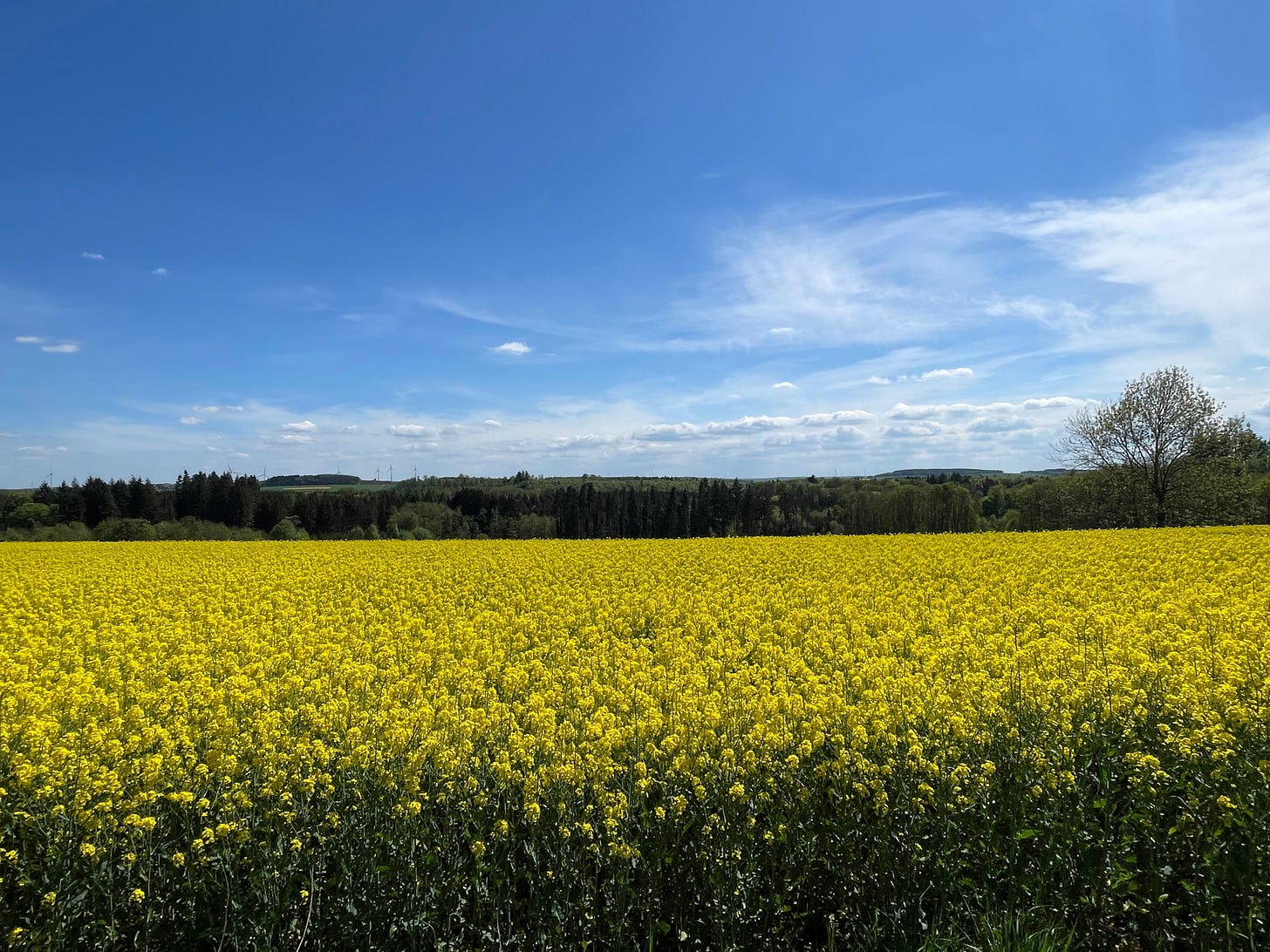 Like an arrow, the train moved forward. I looked through the window. There were still no clouds, nor a red sun in the sky. But I could see yellow fields covered in rapeseed flowers — so typical of spring in Brandenburg. Things moved rapidly, disappearing behind me. I thought about the urgency of noticing time as it manifests in the things of this world. About experiencing the subtle progression of phosphenes, the train moving forward, the rapeseed flowering only for a couple of weeks, next to the rye swaying like a pendulum in the wind — a true champion of time.
