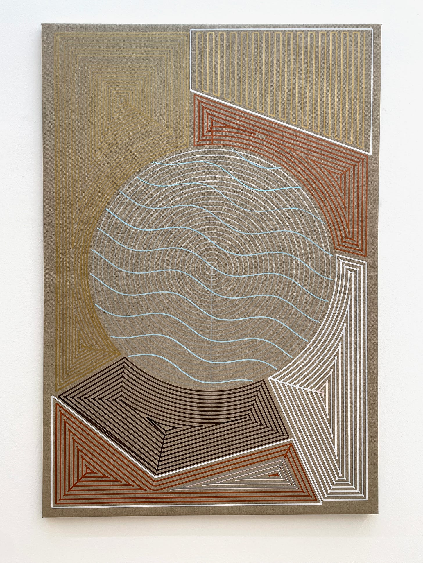 The works in the exhibition reference great floods or suggest subtle flows of water—layering, colliding, diverted, or stalled. Kuai is the name of a new series of paintings premiered in this show. These works explore hydrodynamic forces translated into geometric forms that either communicate or obstruct one another.