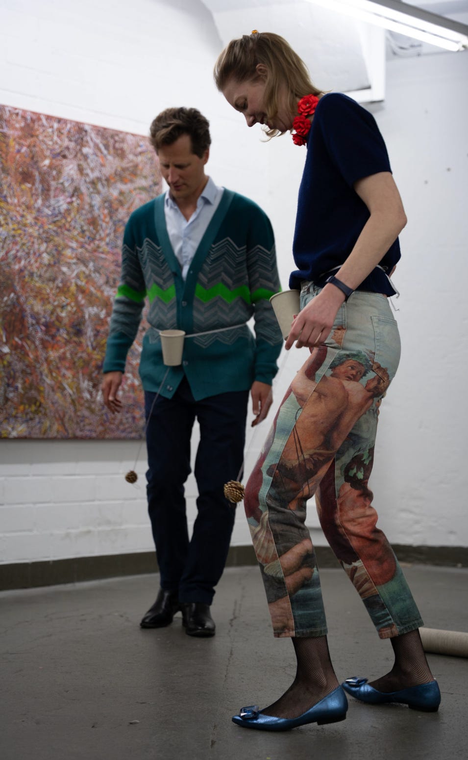 The game, a kind of Mexican human balero, consists of wearing a belt with an empty cup attached to the front, instead of a belt button, and a small ball that hangs from a thread between the participant’s legs. The objective is to move the hips so that the ball swings and falls inside the cup. Most participants moved their bodies back and forth like a strange pendulum, which was amusing and somehow sexual. Others broke the toy or tried alternative, football-inspired gestures. While the game should not be much of a challenge for Colombians or Panamanians, in Germany, some did better than others. But the point was not to master it, but to laugh, fail, and embrace the unattainable.